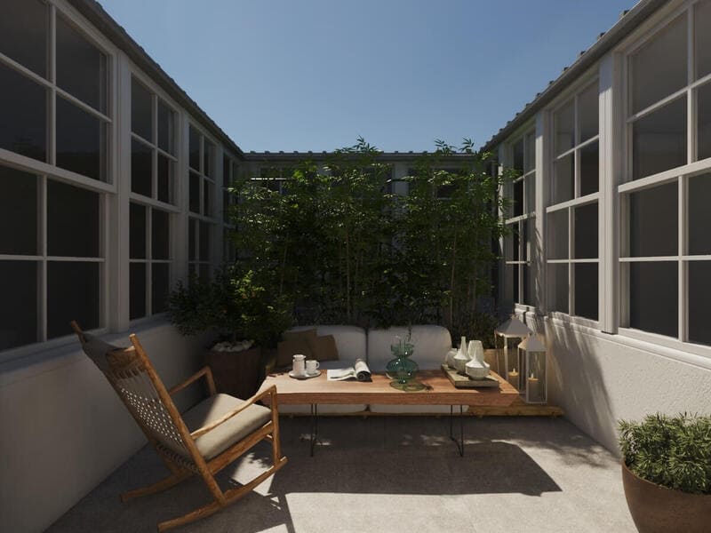 Esta rehabilitación integra el diseño actual de las viviendas con el respeto de la fachada del edificio, su patio y su escalera interior.